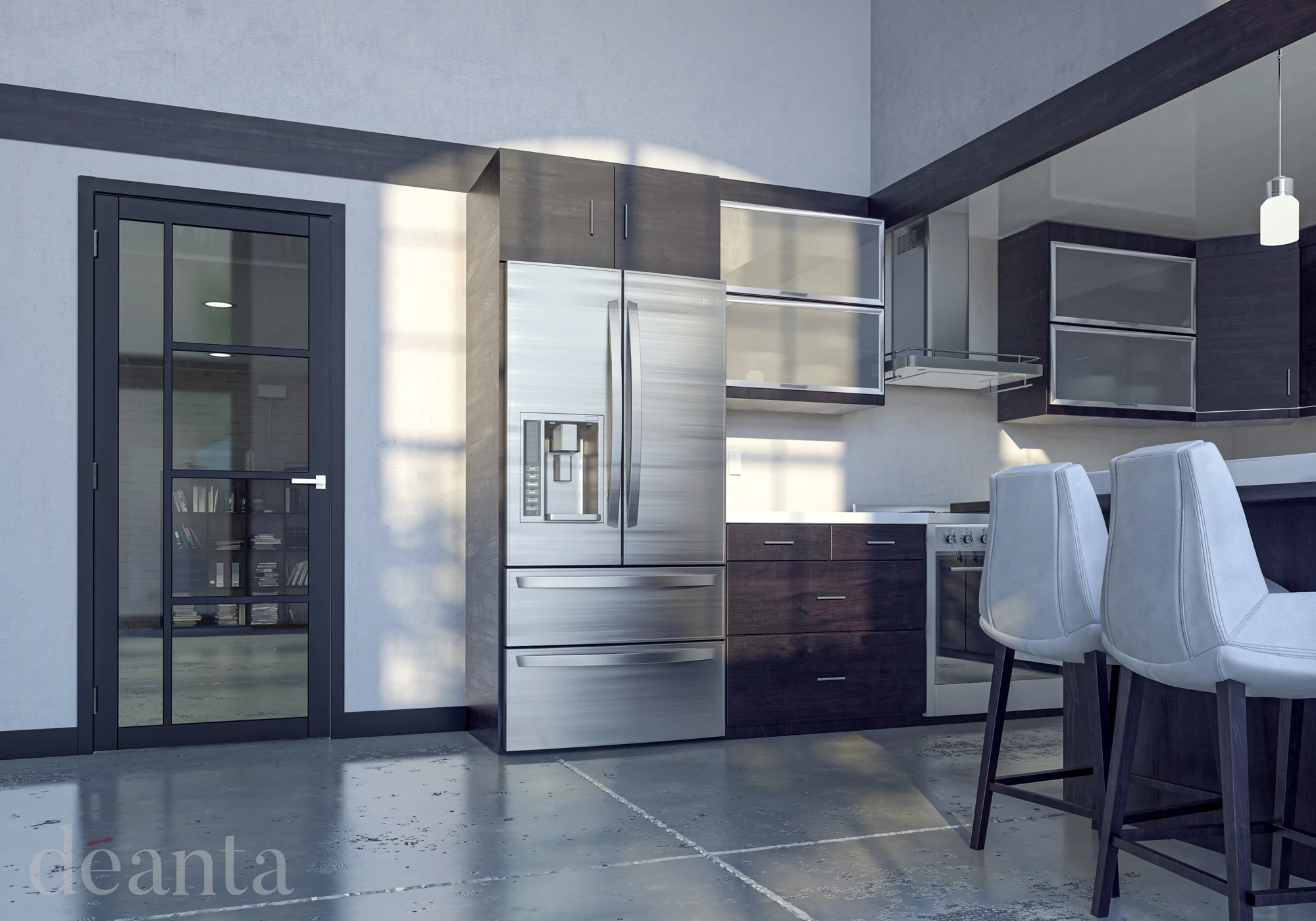 The Deanta Brixton Black Prefinished Tinted Glazed Door is a stylish internal door finished in factory-applied black paint with tinted glass panels, designed to combine privacy and light flow in contemporary UK interiors.