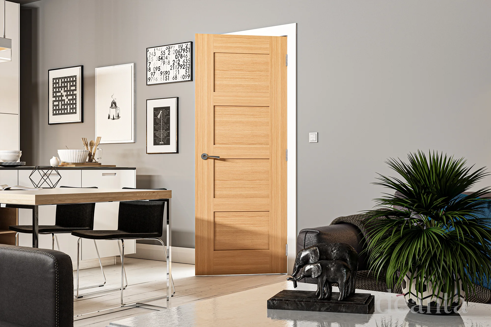 The Coventry oak Internal door is equally at home in a farmhouse, cottage, apartment, newbuild, or townhouse. The minimalist style of this door is at once traditional and contemporary. striking and understated, rustic and sleek. The solid version of the door features four evenly sized panels of crown-cut oak veneer within a simple veneer surround.