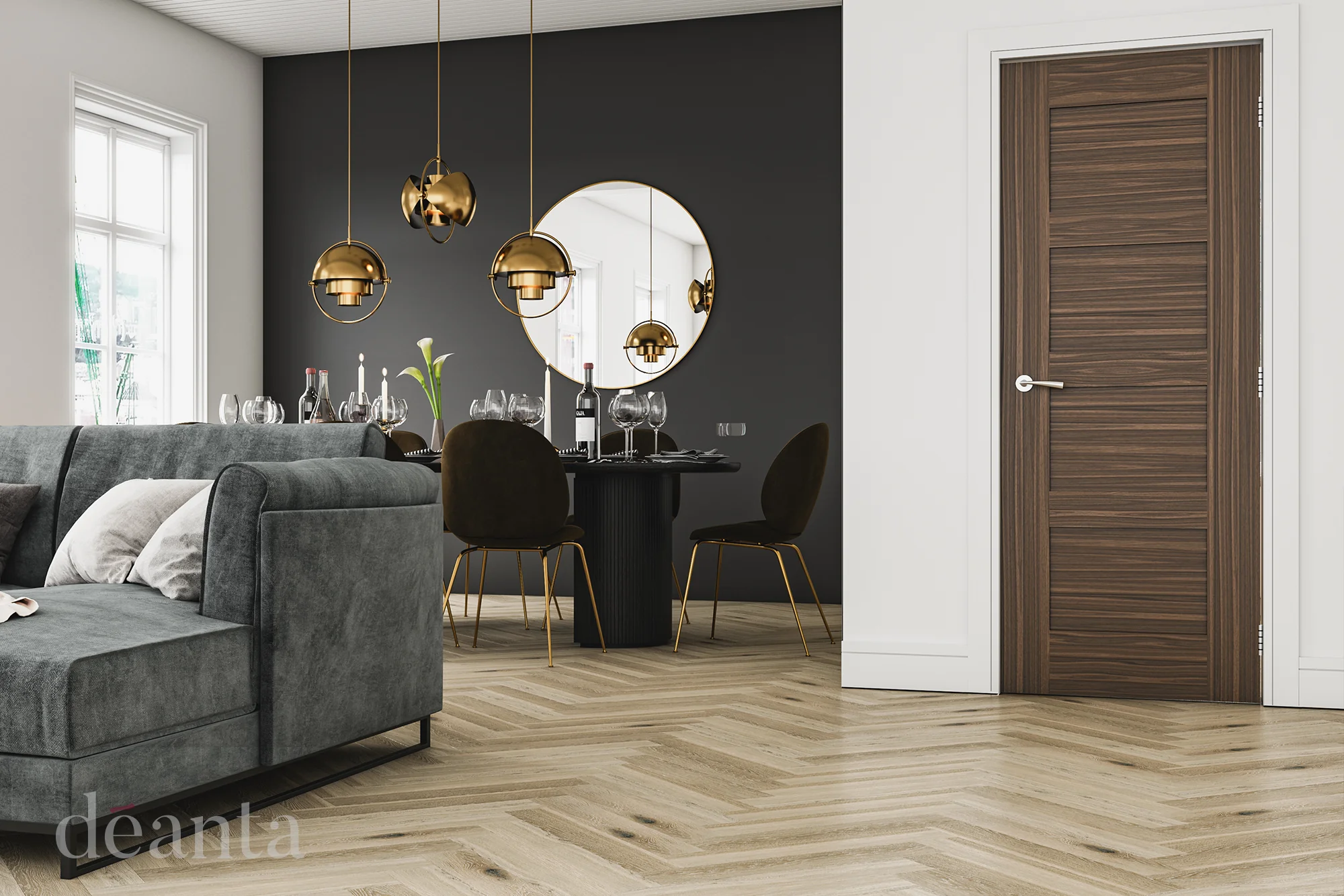 The Deanta Walnut Coventry Fire Door Pre-finished FSC is a premium internal fire door featuring a factory-applied walnut veneer finish and FSC certification. It combines timber aesthetics with FD30 fire protection, making it suitable for safety-compliant UK homes and buildings.